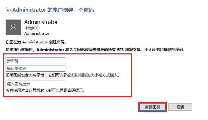 5、接着根据操作提示信息,我们依次输入“新密码”-“确认新密码”-“键入密码提示”,点击“创建密码”即可。