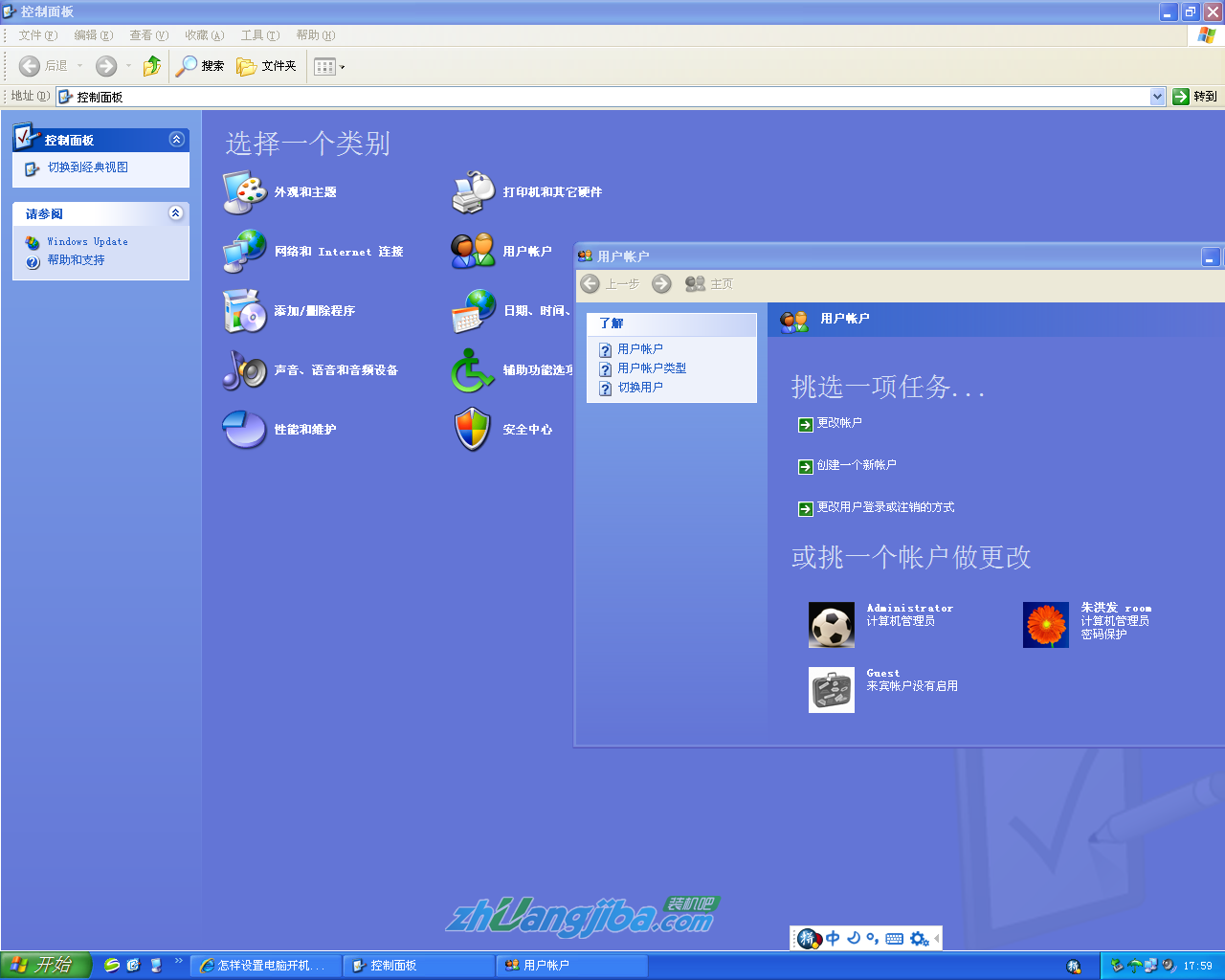 重启电脑后,到启动界面窗口时按Ctrl+Alt键,接着双击Del键,这时便会出现新的登录界面,在用户名输入“Administrator”,密码不用输入,回车即可,登录后打开控制面板——用户账户——更改账户——选择你原来的“账户名——更改我的密码——输入新密码,再次输入确认就可以了。