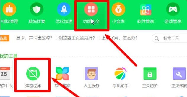 1、首先打开360软件,点击菜单栏中的功能大全,找到小程序弹窗过滤。