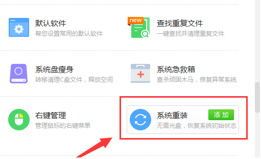 1、打开360卫士,点击功能大全,找到系统重装,然后添加。