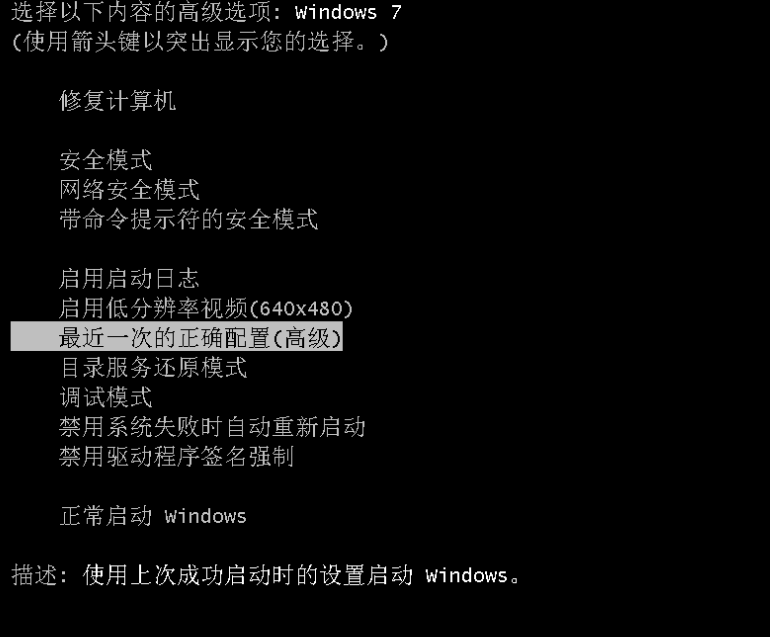 1、开机时出现画面立即不停按f8,选择最近一次正确配置进入系统。