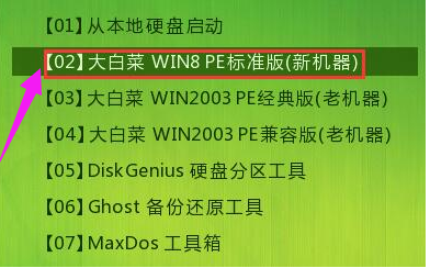 1.将大白菜u盘的启动盘插入电脑,重新启动按快捷键引导u盘进入主菜单,选择第二项进入win8pe系统。