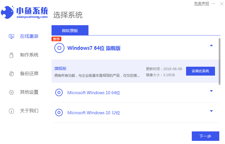 1.首先去浏览器下载小鱼一键重装系统工具,然后关闭杀毒软件,打开小鱼选择需要的win7系统安装。