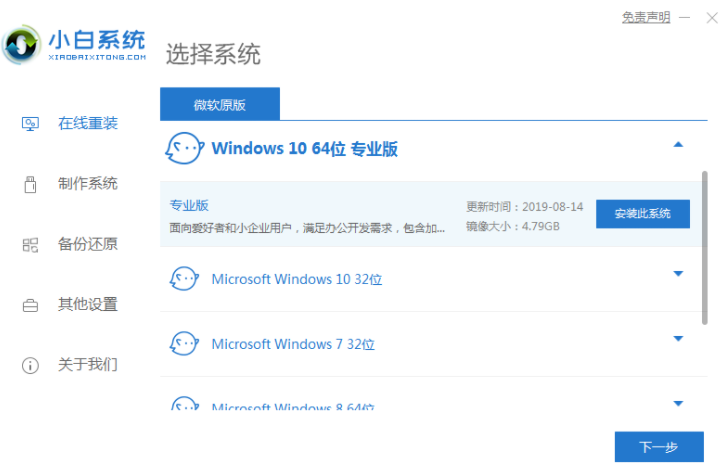 1.先在台式机上下载安装一个小白一键重装软件,打开软件后选择我们想安装的系统。