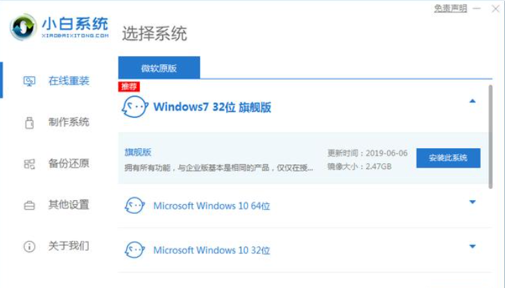 1、电脑怎么重装电脑系统?打开小白一键重装系统工具,选择在线重装选项下的win7旗舰版系统进行安装