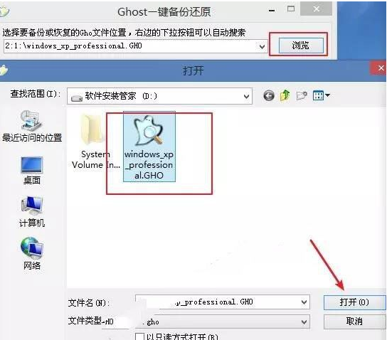 5.点击“浏览”,选择U盘中的“windows_xp_professional”文件,点击“打开”。