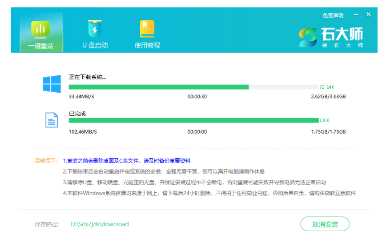 1、下载并运行石大师一键重装系统,点击确认安装此系统后进行下一步。