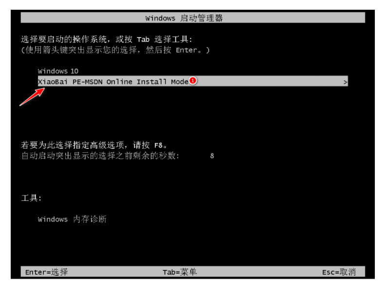 5、重启电脑后,在选择第二个 XiaoBai -MSDN Online Install Mode 菜单,按回车进。