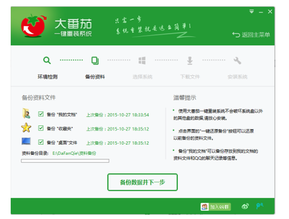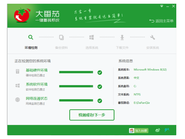 1、下载并打开大番茄一键重装系统软件,点击“立即重装系统”进入环境检测,等待软件鉴定你的电脑系统是否符合安装环境要求,然后进入下一步。