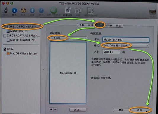 5、选择需要安装系统的硬盘,点击【分区】,分区布局选择【1个分区】,格式选择【Mac OS扩展(日志式)】,点击应用。