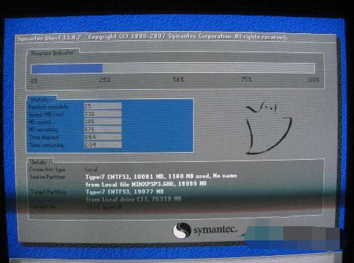 4.启动进u盘WINPE,新本本要先分区,双击桌面左下角的“自动安装系统”,然后按任意键开始复制系统,等待复制完后系统会自动重启安装。