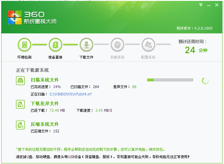 2、使用360云重装引擎,智能匹配用户系统与云端微软标准系统差异,动态下载系统文件和注册表,然后经过格盘重装引擎重新安装和配置系统。
