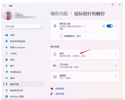 进入到设置窗口后,在左侧找到“辅助功能”,再点击右侧鼠标指针和触控。