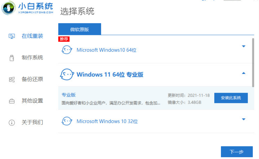 1、电脑下载小白一键重装系统软件安装,然后正常打开。在在线重装中选择 Windows 11 64 位专业版后点击下一步。
