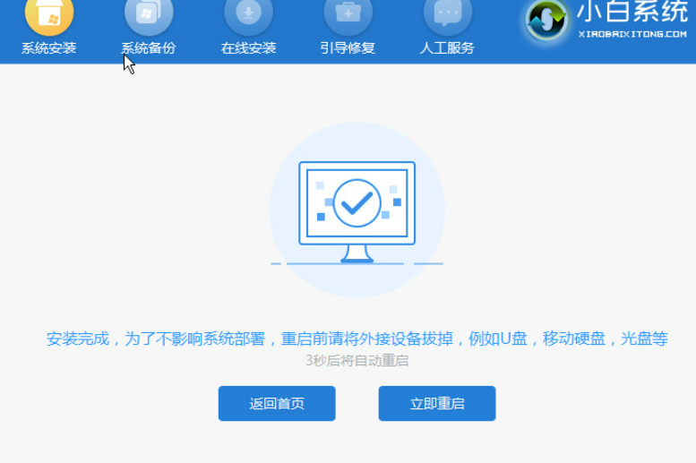 5、进入 Windows PE 系统后一般默认情况下会自动打开小白装机工具进行安装,一般安装后同样是提示我们重启电脑。只需要立即重启即可。