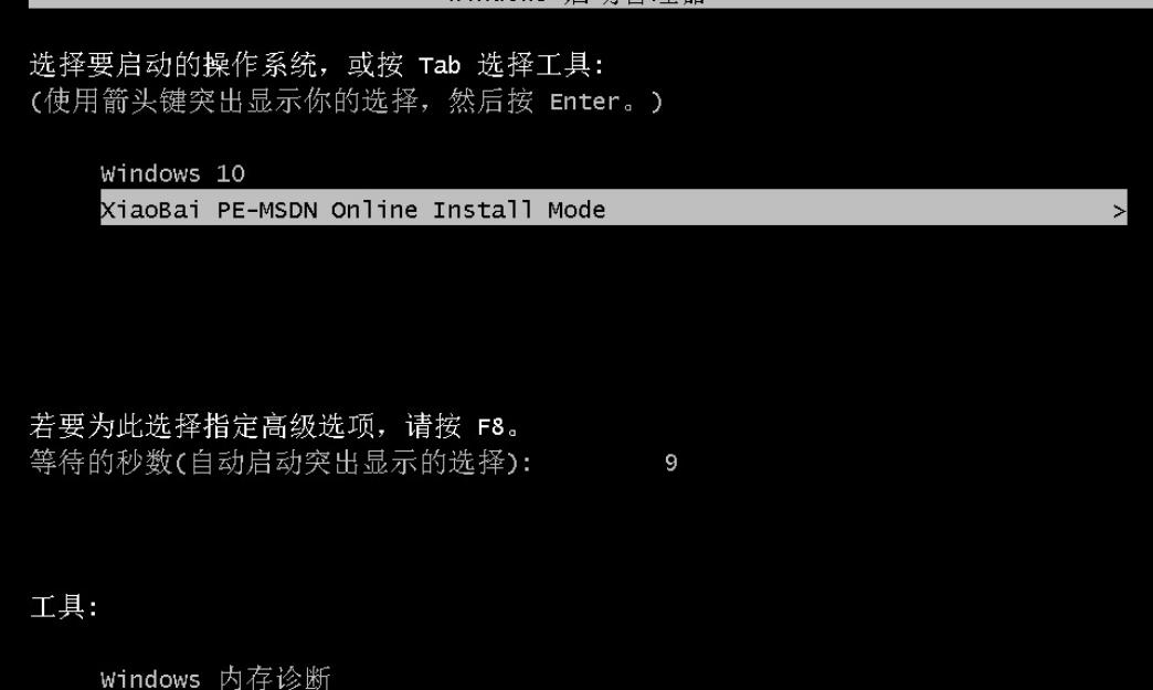 4、重启后,我们会进入到 Windows 引导菜单选择,这时候我们选择第二个 XiaoBai PE-MSDN Online Install Mode(意思是小白在线安装模式)进入 Windows PE 系统。