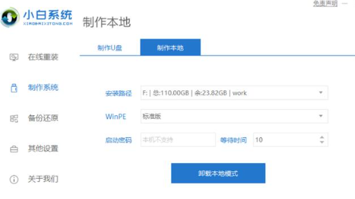 2、打开小白一键重装系统软件,选择本地模式,此时下载一个本地pe。然后我们把pe系统安装在C盘以外的分区。