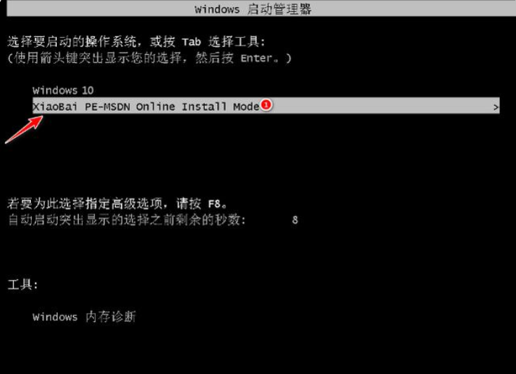 3、系统下载完成后重启电脑操作,进入启动项页面时,选择第二项选项小白pe进入pe系统。