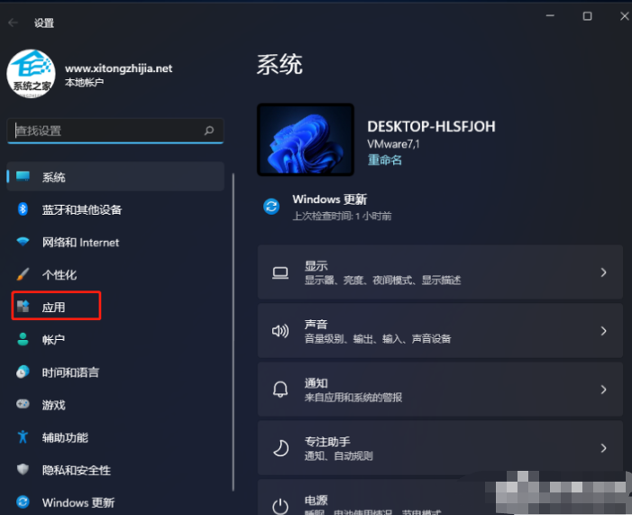 3、设置窗口,左侧边栏,点击应用;