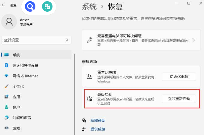 2.进入恢复之后点击下方“立即重新启动”。