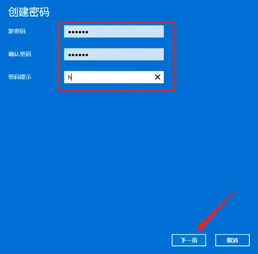 4、然后输入两次自己想要设置的开机密码,点击下一页,直到点击完成即可。