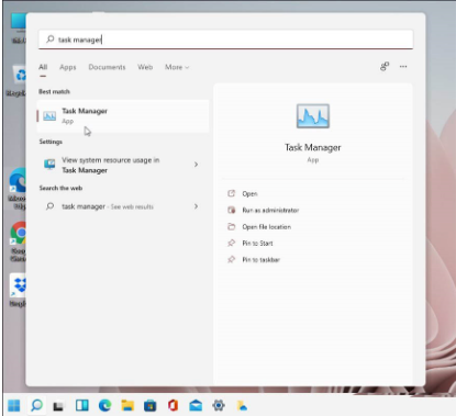2、还可以可以点击“搜索”图标并键入: 任务管理器,点击您获得的最上面的结果——就像在 Windows 10 上搜索内容一样哦。