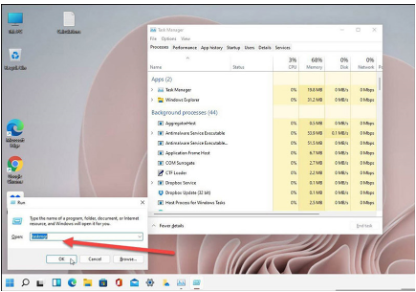 1、同时按Windows键+ R键盘打开运行对话框,并在类型: taskmgr,点击确定或者按键盘上的Enter,它会弹出打开。