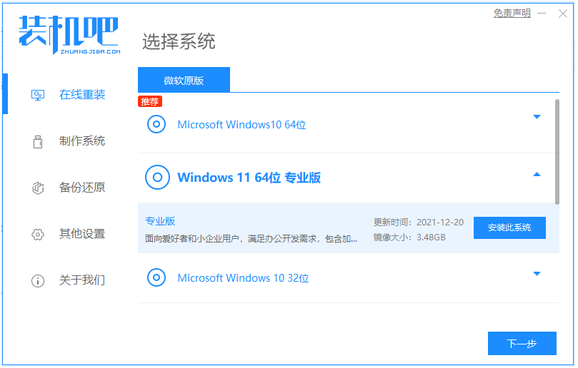 1、首先自行下载安装好装机吧一键重装系统软件,打开后选择win11系统安装。