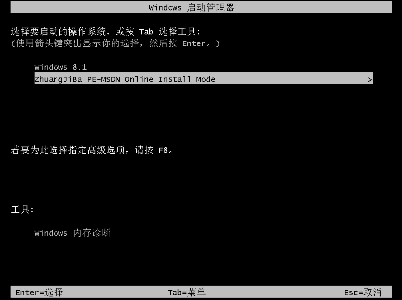 4、来到启动界面,选择zhuangjiba pe-msdn项进入pe系统内。