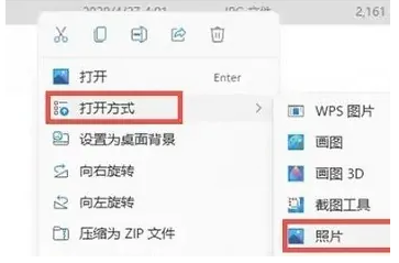 1、win11如何压缩图片,首先找到要压缩的图片,然后右击点击“打开方式”选择“照片”。